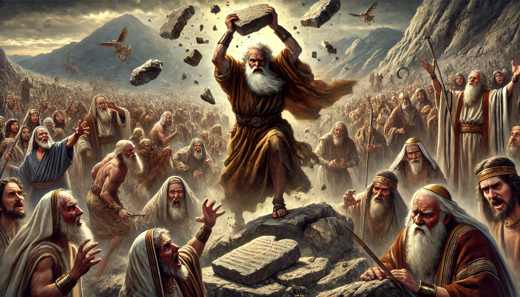 모세는 40일 동안 하나님과 함께하며 율법이 새겨진 돌판을 받았습니다. 하지만 산 아래에서는 이스라엘 백성이 금송아지를 만들어 우상을 숭배하고 있었습니다. 이를 본 모세는 분노하여 돌판을 깨뜨렸고, 우상을 불태워 가루로 만든 뒤 백성들에게 마시게 했습니다.