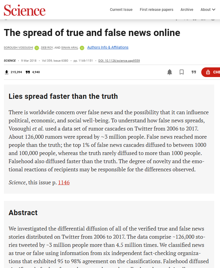 - Vosoughi, S., Roy, D., & Aral, S. (2018). The spread of true and false news online. Science, 359(6380), 1146-1151.